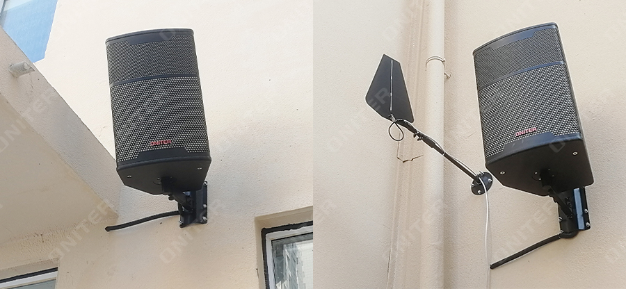 内庭院采用了4个12寸防水音箱和15寸低音作为扩声设备,1台专业功放将处理过的音源进行放大;