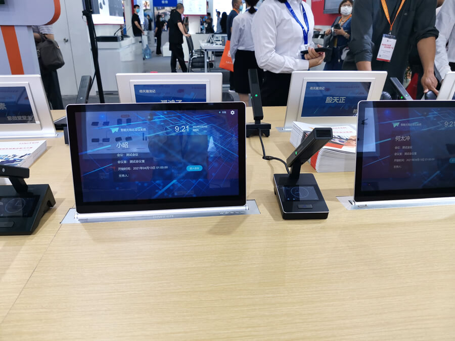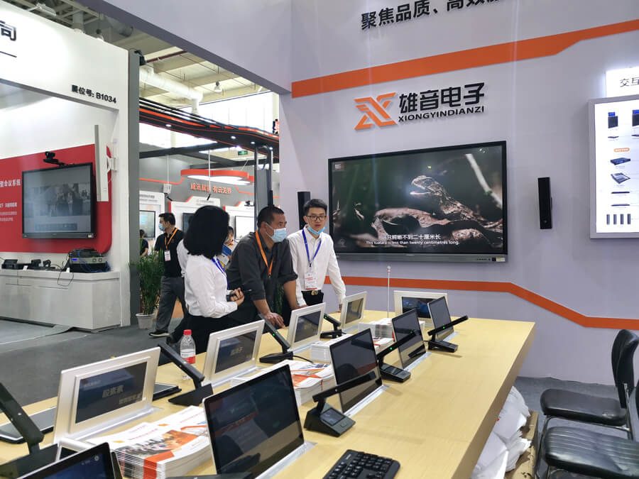 在展出的众多新品中,最受关注的是雄音电子(ONITER)最新发布的交互式智能无纸化会议系统。